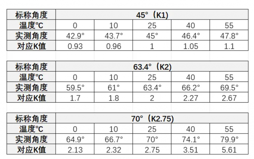 2、溫度對材料聲速的影響引起橫波折射角(K值)的變化