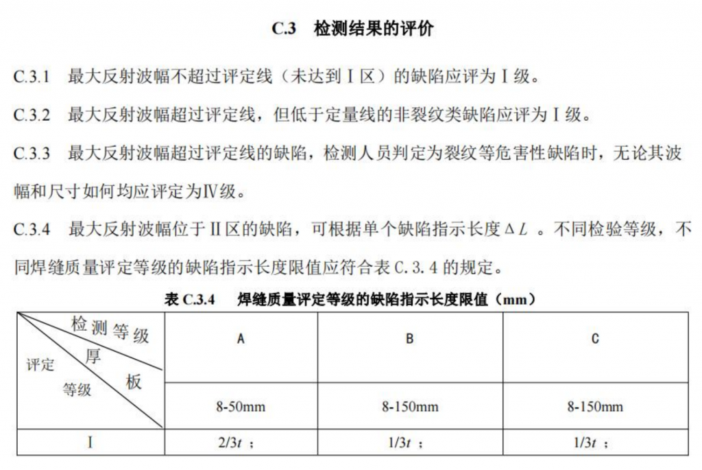 | 評級 | Ⅰ區缺陷為Ⅰ級, Ⅱ區缺陷根據指示長度評級, III區缺陷為Ⅳ級 | 根據顯示長度與板厚的倍數關系確定驗收等級 | |